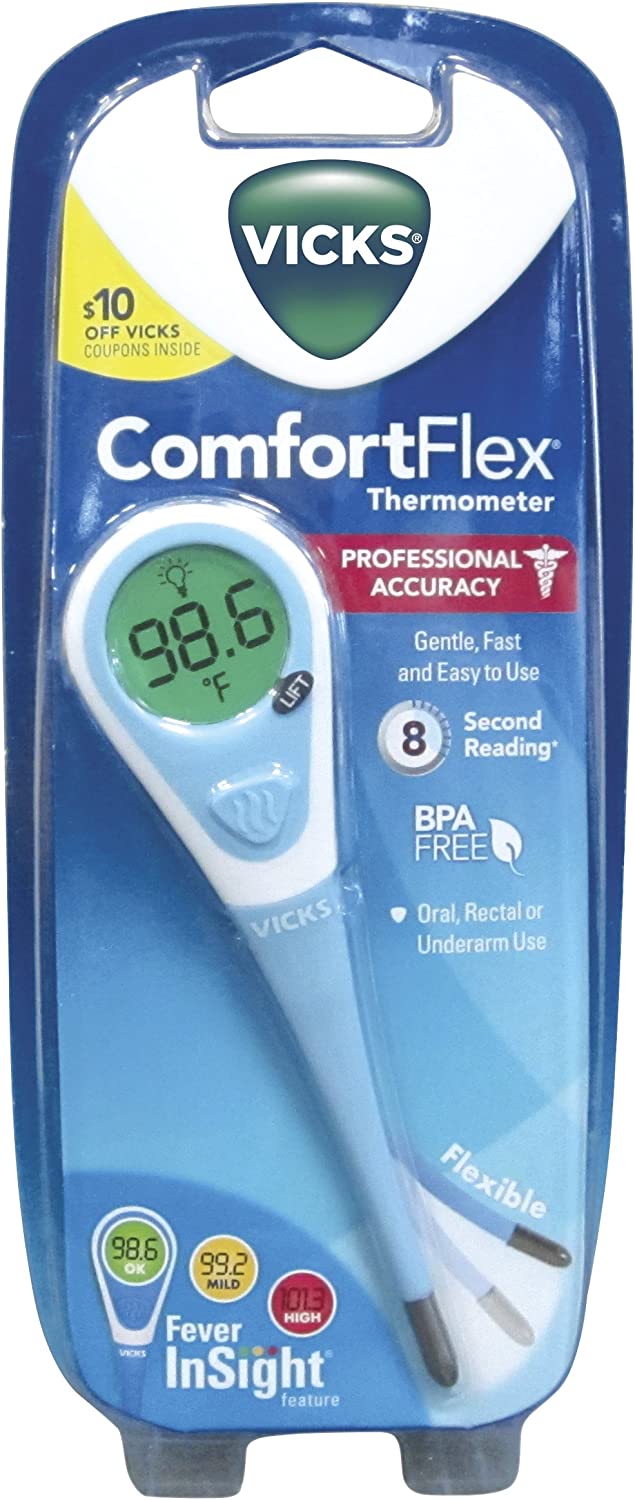 Get temperature results quickly and easily, when you need them most. The Vicks ComfortFlex Digital Thermometer provides accurate readings within +/- 0.2 degrees F in only 8 seconds. Designed for comfort and convenience, this thermometer has a flexible tip. The unique Fever InSight guide helps you get temperature readings at a glance with a color coded display, and understand them easily. A green display suggests a normal temperature, yellow signifies an elevated temperature and a red display indicates a high temperature. Because it can be used as an adult thermometer for oral readings as well as be used a rectal thermometer for babies or even used under the arm for toddlers and kids, it’s perfect for the whole family. It also has a memory feature that recalls and displays last temperature taken and is waterproof for easy, thorough cleaning. Plus, this temp thermometer includes a storage case, battery and has a limited 1 year warranty.