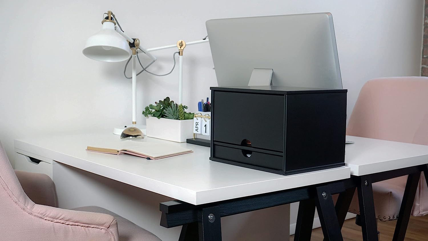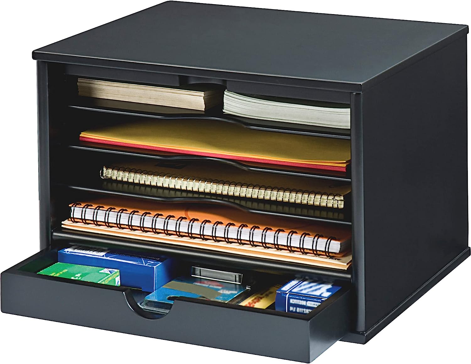 The Victor Midnight Black Collection brings a fresh perspective to desk accessories by offering functional solutions with appealing design elements. The 4720-5 Desktop Organizer provides four shelves and one large drawer for flexible storage of files and desk supplies. The sliding door on top pulls out and closes in front to easily hide contents when you want a clean look. Combine two or more Desktop Organizers to create an elegant literature rack or storage system. Features sturdy 11.9 lb. wood construction with a durable double coated matte black finish. Stylish 14" x 10.75" x 9.75" design with crown molding base makes a great addition to any desk. Perfect for use either at home or in the office. Enter the search term “Victor Midnight Black Collection” to see the entire lineup including: Corner Shelf, Printer Stand, Stacking Letter Tray, Business Card Holder, Monitor Riser, Magazine Holder, Tidy Tower, Incline File, Reversible Book End, Pencil Cup with Note Holder.