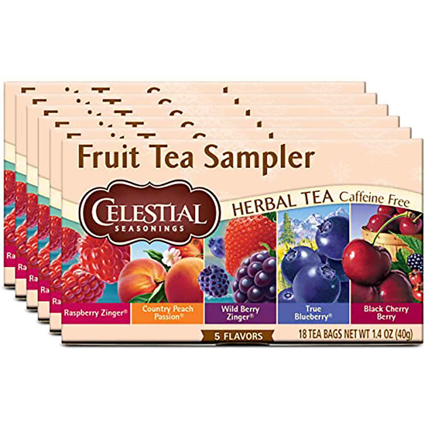 Celestial Seasonings Herbal Tea, Fruit Tea Sampler, Raspberry Zinger, Country Peach Passion, Wild Berry, True Blueberry & Black Cherry Berry, Caffeine Free, 18 Tea Bags (Pack of 6)