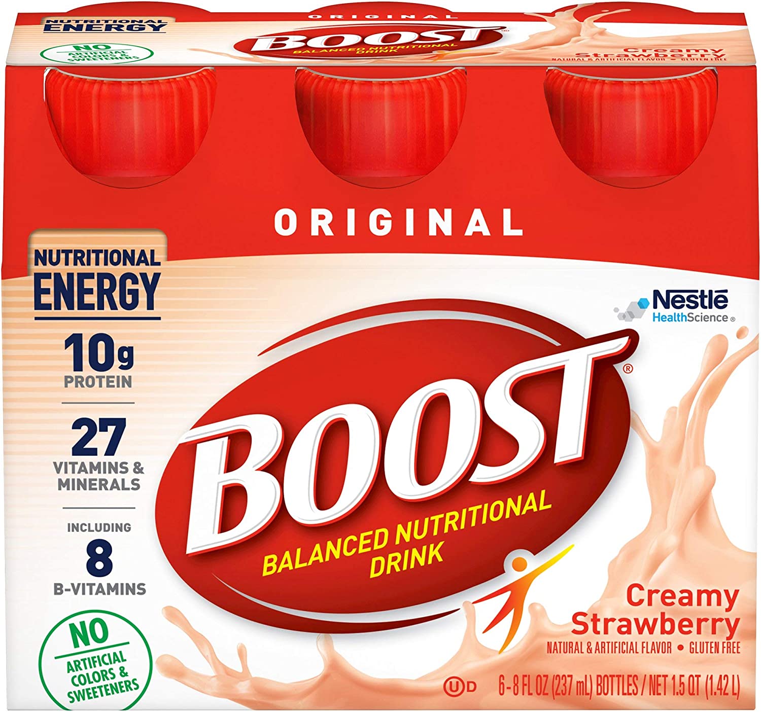 BOOST Original: This drink is designed to provide nutritional energy with 240 nutrient-rich calories and B-vitamins to help convert food to energy, plus 10g protein and 27 vitamins and minerals for balanced nutrition