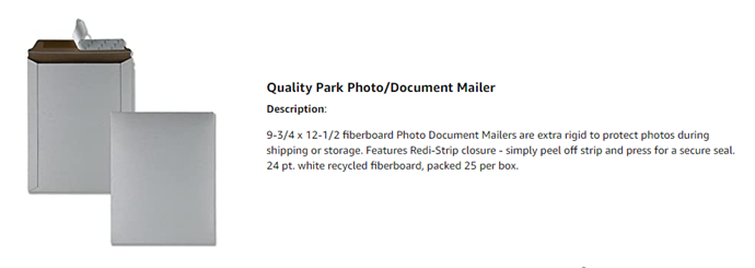 Extra-rigid fiberboard mailer protects photos and documents. No more bent photos -- rigid fiberboard backing resists bending so photos arrive at their destination in pristine condition. Features Redi-Strip for convenient closure and a tear strip for easy opening.