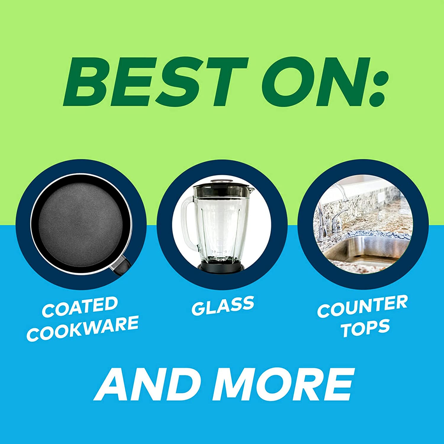 • Safe on non-stick cookware, countertops, showers, tubs, and more