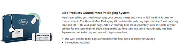 | Included Components | Poly bag tape machine, 1 roll of poly bag tape and 50-1lb wild game bags |