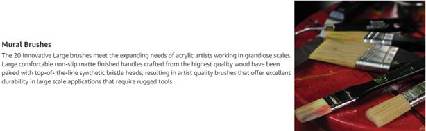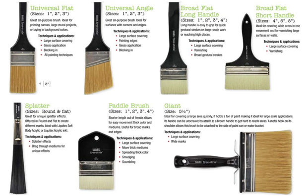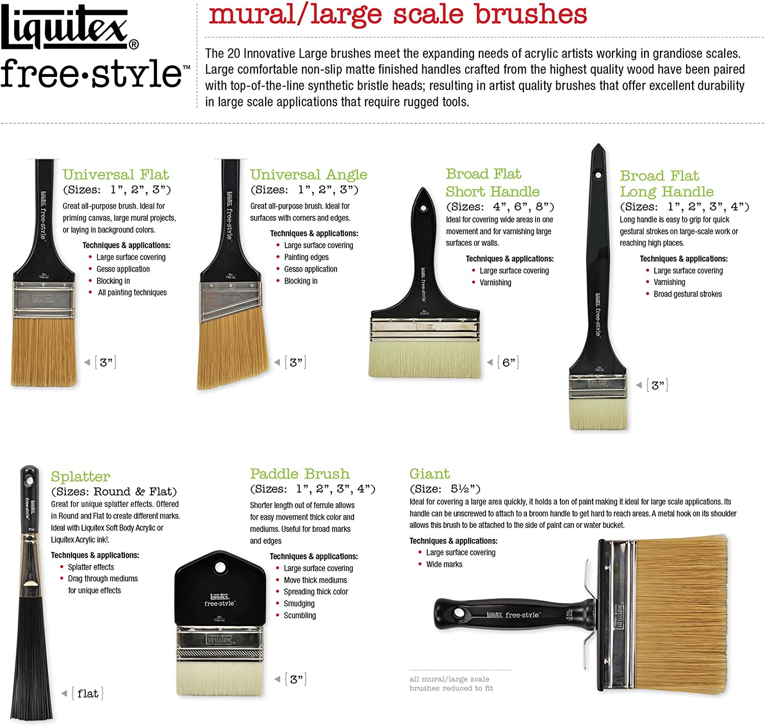 At Liquitex, we understand that it takes more than just good paint to produce a truly great piece of art. That’s why we’ve created our professional range of artist brushes. Liquitex Freestyle Brushes are the perfect tools for virtually any artistic application. Designed by artists for artists, these brushes have unique ergonomic handles and strong synthetic bristles that make them both comfortable and durable. If you work really large, our innovative ranges of large painting knives and brushes, in unique shapes and sizes, are designed to facilitate your creative expression on a grand scale. Liquitex Freestyle Paddle Brushes meet the expanding needs of acrylic artists working in grandiose scales. Large, comfortable non-slip matte finished handles crafted from the highest quality wood have been paired with top-of-the-line synthetic bristle heads; resulting in artist quality brushes that offer excellent durability in large scaled applications that require rugged tools. Ideal for large-scale work, varnishing. Available in varying sizes. Visit our Liquitex Amazon Storefront for full product assortment.