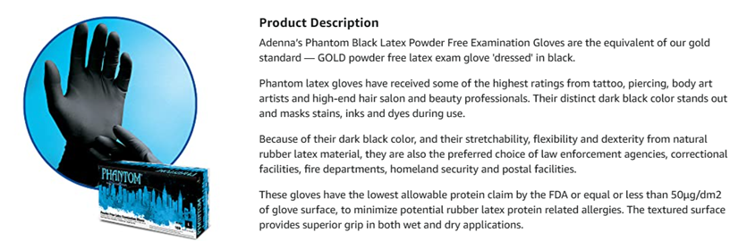 Phantom latex gloves have received some of the highest ratings from tattoo, piercing, body art artists and high-end hair salon and beauty professionals. Their distinct dark black color stands out and masks stains, inks and dyes during use. Because of their dark black color, and their stretchability, flexibility and dexterity from natural rubber latex material, they are also the preferred choice of law enforcement agencies, correctional facilities, fire departments, homeland security and postal facilities These gloves have the lowest allowable protein claim by the FDA or equal or less than 50µg/dm2 of glove surface, to minimize potential rubber latex protein related allergies. The textured surface provides superior grip in both wet and dry applications.