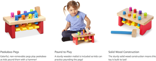 A beloved classic toy gets an exciting new twist with this deluxe pounding bench. As the colorful, non-removable pegs on the bench go up and down, they play peekaboo, taking turns showing their friendly smiles while the child has fun practicing fine motor skills. And you’ll enjoy that because the pegs are attached, they can’t get lost. A sturdy wooden mallet is included. Children delight in striking a peg with the mallet and watching one on the opposite side pop up. Once kids have seen this cause-and-effect in action, they will enjoy predicting which peg will pop up next. As they develop hand-eye coordination and fine motor skills, they will also be learning numbers and colors by counting the pegs and naming each color as it pops up. The Melissa & Doug Deluxe Pounding Bench Wooden Toy makes a great gift for kids 2 to 4 years. This product measures 5.25" H x 10" L x 5" W and includes a sturdy wooden mallet. Add the Melissa & Doug Wooden Latches Board to round out the developmental play and learning experience. For more than 30 years, Melissa & Doug has created beautifully designed imagination- and creativity-sparking products that NBC News called “the gold standard in early childhood play.” Today, Melissa & Doug is proudly partnering with the American Academy of Pediatrics to foster early brain development and help children build important life skills through play.