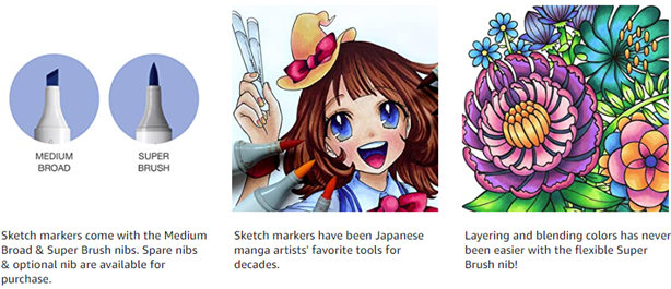 • 【REPLACEABLE NIBS】SUPER BRUSH & MEDIUM BROAD: The flexible brush nib is ideal for blending, shading, and for drawing both thick and thin strokes. The broad nib is perfect for producing consistent lines and for adding details to your creations. The broad nib can be also used with the Copic ABS (Airbrush system).