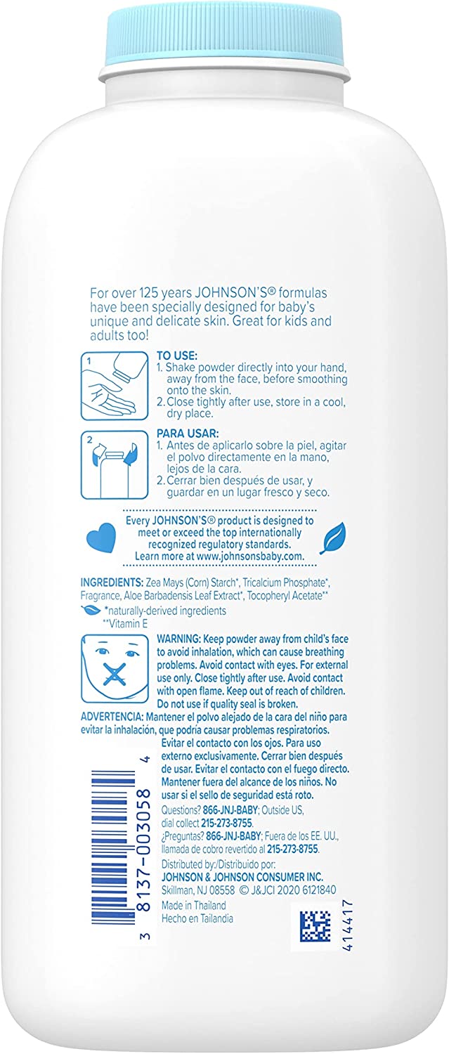 For over 125 years, Johnson's formulas have been specifically designed for baby's delicate skin. To use, shake baby powder directly into your hand, away from the face, before smoothing onto the skin