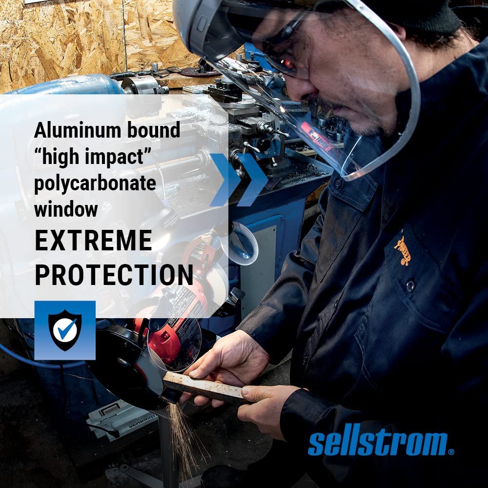 FACE SHIELD FEATURES: Includes a grey abs crown, uncoated clear polycarbonate window with aluminum binding and ratchet headgear and pin closure. Abs injection molded crowns have universal bracket pin pattern for use with any window mount