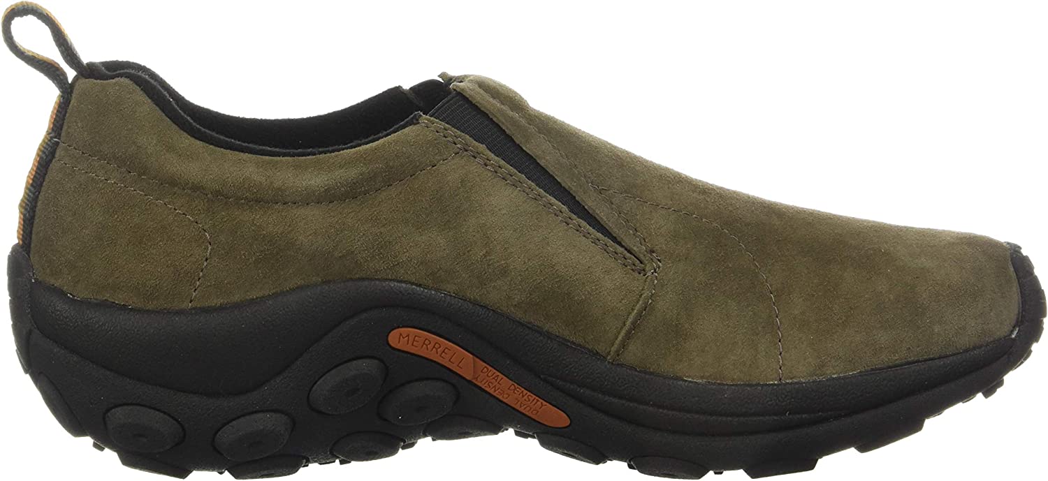 Simple, comfy and casual - the Jungle slip-on from Merrell is a perfect fit. The smooth leather upper keeps things presentable and the elasticized panels deliver a flexible, snug fit and feel. The Jungle Runner sticky rubber outsole has excellent grip across changing terrain while the Air Cushion midsole allows long-wearing comfort.