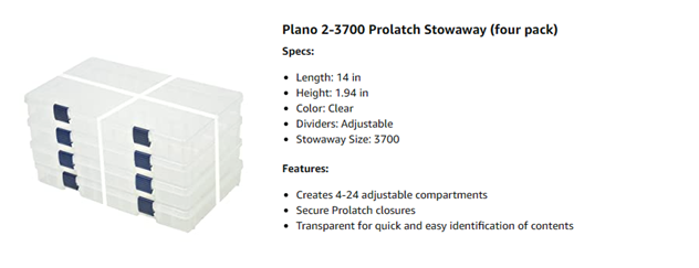 The 2-3700 is one of our most popular size stowaways. It is great for organizational tool for tackle or any small items. The clear lid allows you to see what is inside. This one is a 4 pack.
