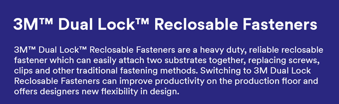 3M Dual Lock Reclosable Fasteners are used extensively in transportation, electronics, business equipment, machinery, medical, and sign and display markets They are ideal for both indoor and outdoor applications including, attaching signs, cushions, enclosure and access panels, banners, doors, adjustable shelving, vehicle ceiling panels, furniture seats and backs, and much more As a general rule, four square inches of fastener area per pound of static tensile or shear load to be supported (4in2 and lb) is suggested as a starting point for evaluation More or less area may be needed depending on specific conditions or end use applications Do not use too much of the reclosable fastener or it will be extremely challenging to separate the two parts Pry off with a screwdriver if necessary Customer is solely responsible for evaluating the product and determining whether it is appropriate and suitable for customer’s application