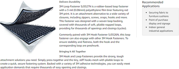 This hook and loop product constitutes a 100 mil to 160 mil engaged thickness and uses a 3.0 mil white polypropylene film liner printed with our red 3M logo. Hook and loop fasteners are effective for securing fabric to furniture cushions, airplane seating, carpet panel attachments, uniforms, gloves and clothing. These types of applications are widely utilized in electronics, construction, specialty vehicle, military, medical, furniture, as well as general industrial operations where securing surfaces that can be unfastened and refastened thousands of times with no bulging rivets, screws or bolts is desired.