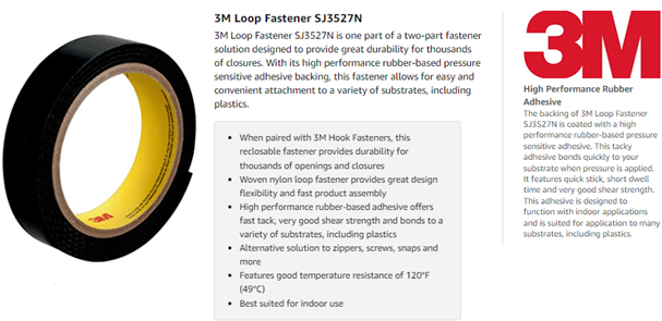 3M Hook/Loop Fastener TB3526N/TB3527N is a best in class fastener that provides design flexibility and fast product assembly. With its high performance rubber-based pressure sensitive adhesive backing, this fastener allows for easy and convenient attachment to a variety of substrates, including plastics.