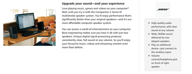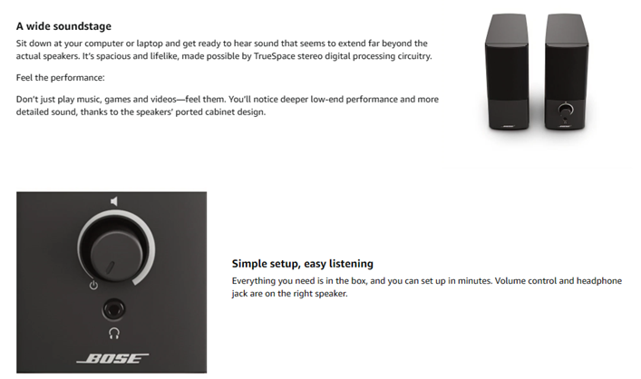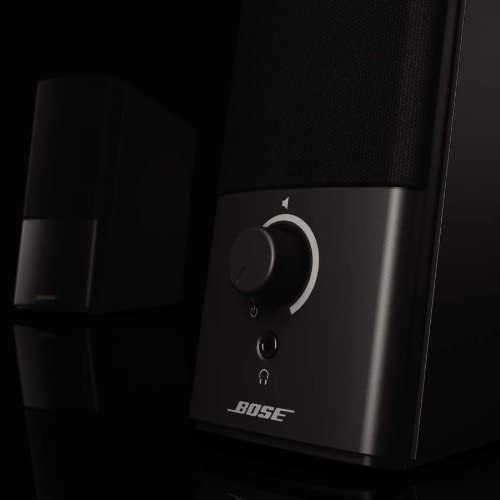 Do you love playing music, games and videos on your computer? Wait until you try it with the Bose Companion 2 Series III multimedia speaker system. You'll enjoy performance that's significantly better than, your original speakers, and it's the most affordable computer speaker system from Bose. You can access a world of entertainment on your computer. Bose engineers make sure you hear it all with just two compact, elegant speakers. Unique digital signal processing produces clear, full sound at any volume. So you'll enjoy your favorite music, videos and streaming content even more than before. Sit down at your computer or laptop and get ready to hear a sound that seems to extend far beyond the actual speakers. It's spacious and lifelike, made possible by TrueSpace stereo digital processing circuitry. Don't just play music, games and videos feel them. You'll notice a deeper low end performance and more detailed sound, thanks to the speakers ported cabinet design. Everything you need is in the box, and you can start enjoying better sound in minutes. Volume control and headphone jack are on the right speaker. Use the auxiliary input to bring Bose performance to another audio source such as your iPhone or iPad. Upgrade your sound and your experience with Bose Companion 2 Series III speakers.