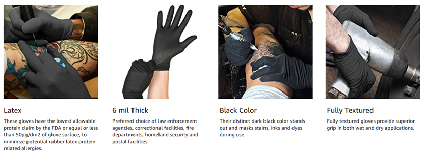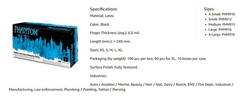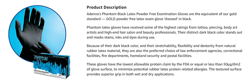 Phantom latex gloves have received some of the highest ratings from tattoo, piercing, body art artists and high-end hair salon and beauty professionals. Their distinct dark black color stands out and masks stains, inks and dyes during use. Because of their dark black color, and their stretchability, flexibility and dexterity from natural rubber latex material, they are also the preferred choice of law enforcement agencies, correctional facilities, fire departments, homeland security and postal facilities These gloves have the lowest allowable protein claim by the FDA or equal or less than 50µg/dm2 of glove surface, to minimize potential rubber latex protein related allergies. The textured surface provides superior grip in both wet and dry applications.