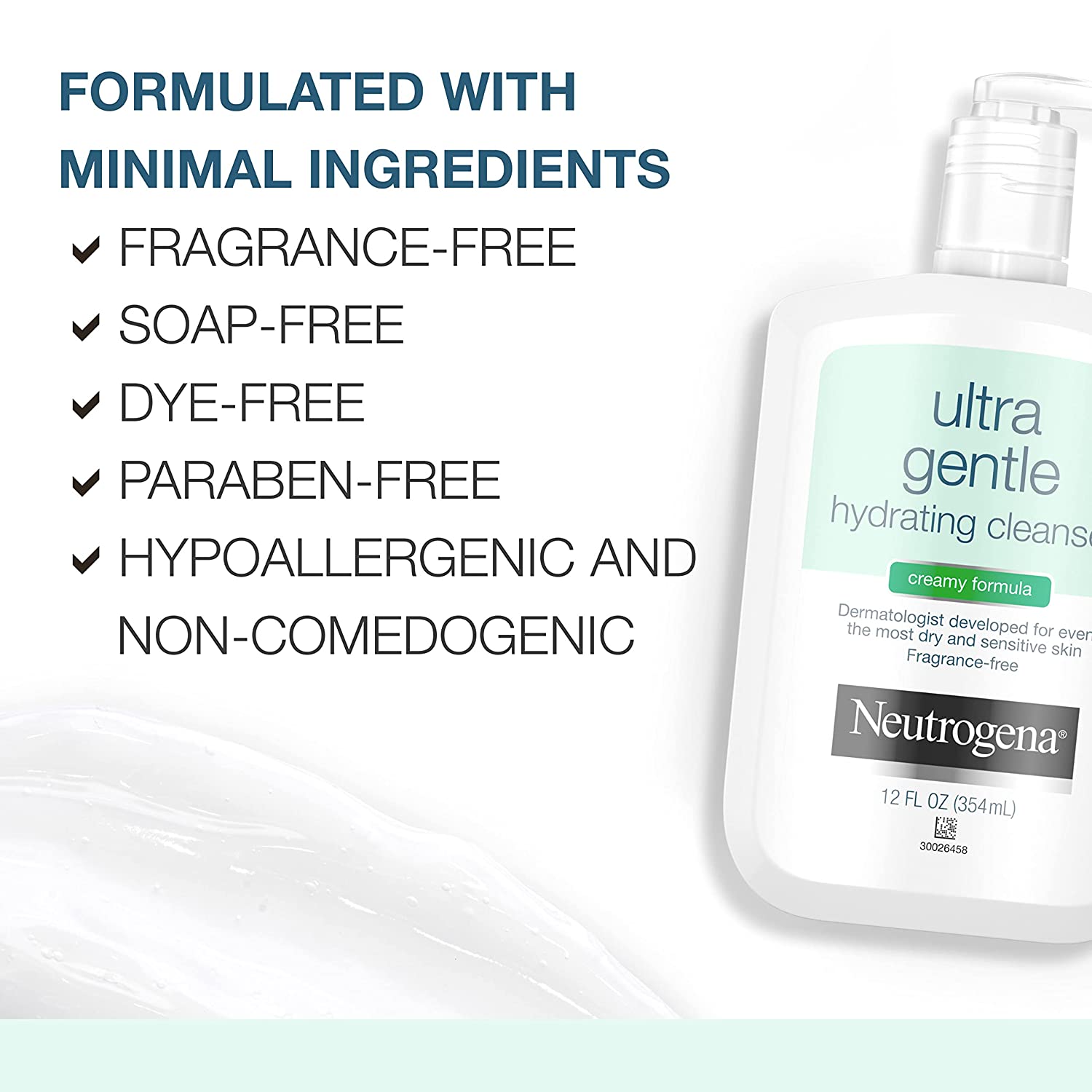 12-fluid ounce bottle of Neutrogena Ultra Gentle Hydrating Facial Cleanser for sensitive skin effectively cleanses face while leaving skin feeling moisturized and naturally soft