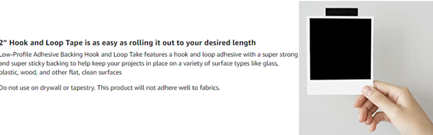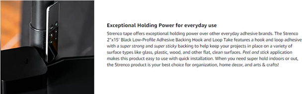 The tape is 2 inch wide with 5 yards of loop and 15 feet long on each side with hook and loop straps. The hook and loops grab on well to the surface and the adhesive on the back of the hook and loop holds to whatever item, whether it be a wallboard, a pictures, or a handful of cables. Use it for mounting, hanging, organizing,and securing and never worry about the durability and strength of the Strenco product because Strenco means holding power. Simply peel and begin the application.