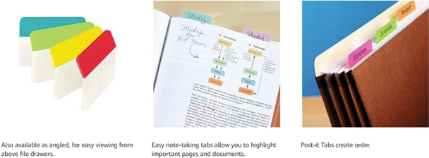 Post it Tabs in 1 inch size create necessary order by easily organizing planners and calendars into sections. Solid color bars give you flexibility to organize by color. Tabs are durable, you can write on them, and reposition as needed. They are also great for planners, binders and file folders. Tabs stick securely and remove cleanly. Aqua, Yellow, Pink and Violet. Contains 22 tabs/color and 88 tabs/on the go dispenser.