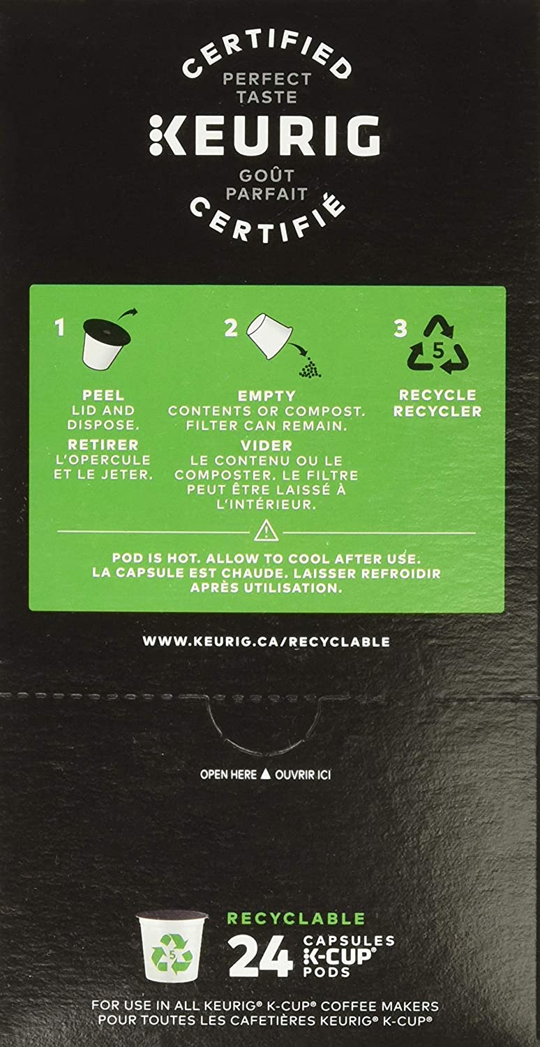 • RECYCLABLE K-CUP PODS: Simple. Delicious. And Recyclable. Enjoy the same great-tasting coffee you know and love, and when you’re done just peel, empty and recycle. Check locally, not recycled in all communities. Packaging may vary.