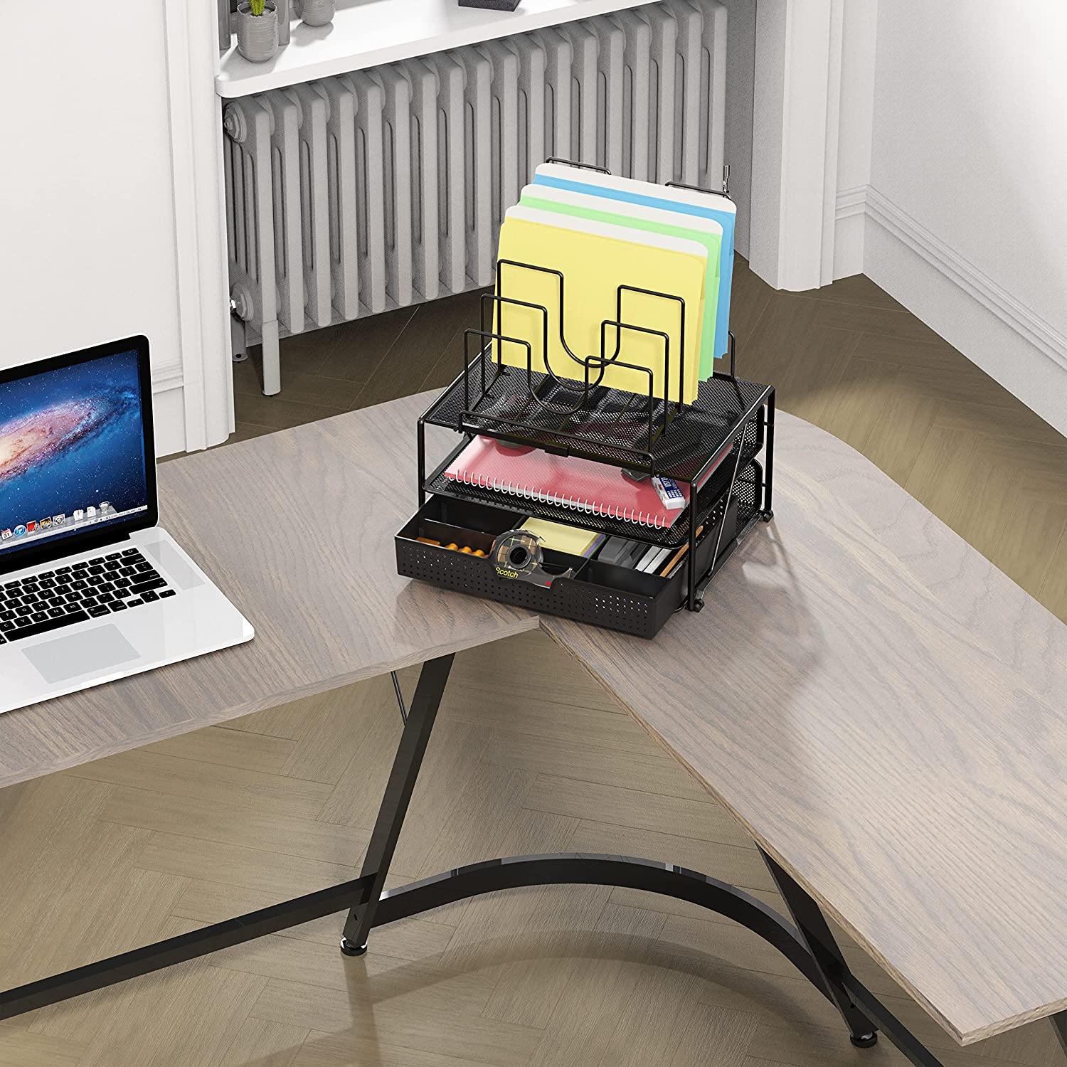 DecoBros Mesh Desk Organizer with Double Tray, 5 Stacking Sorter Sections and Sliding Drawer, Black