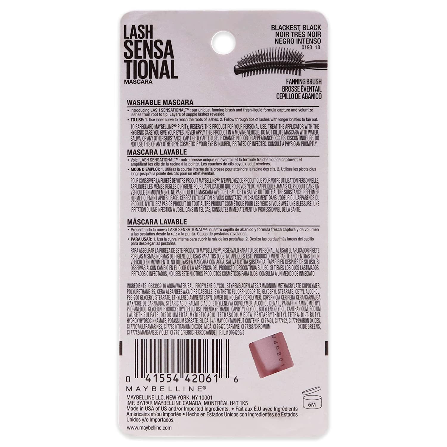 Maybelline Lash Sensational Washable Mascara, Lengthening and Volumizing for a Full Fan Effect, Blackest Black, 1 Count