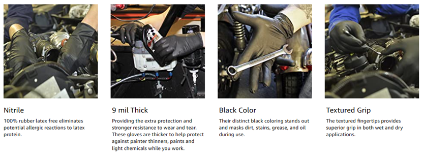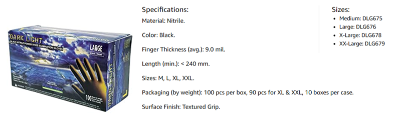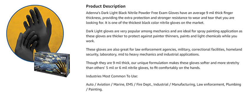 Adenna’s Dark Light Black Nitrile Powder Free Exam Gloves have an average 9 mil thick finger thickness, providing the extra protection and stronger resistance to wear and tear that you are looking for. It is one of the thickest black color nitrile gloves on the market. Dark Light gloves are very popular among mechanics and is ideal for spray painting application as these gloves are thicker to protect against painter thinners, paints and light chemicals while you work. These gloves are also great for law enforcement agencies, military, correctional facilities, homeland security, laboratory, mid to heavy mechanics and industrial applications. Though they are 9 mil thick, yet our unique formulation makes these gloves softer and more stretchy than others’ 5 mil or 6 mil nitrile gloves, to fit comfortably on the hands.