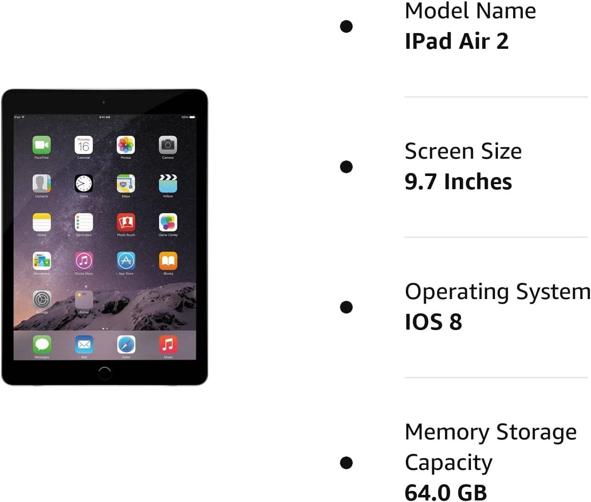 Put the power of a PC in the palm of your hand with the Apple iPad Air 2 Tablet. With iOS 8 Operating System, Apple A8x processor, and 1.5 GHz processing speeds, this tablet has the power to handle just about any job. The 9.7-inch 2048 x 1536 resolution screen displays your videos, emails, browser, and more, in perfect clarity, while the multitouch feature allows you to navigate with the touch of a finger. Take pictures or record video in 1080p HD with the 5 MP iSight Camera, or in 720p with the 1.2 MP "FaceTime HD" camera. 64 GB integrated storage and 2 GB RAM provide the space you need to save all your pictures, videos, games, and more. With hundreds of thousands of apps to choose from, the iPad Air 2 will always keep you entertained. Stay connected from anywhere with the standard 802.11a/b/g/n airport or Bluetooth 4.0. And with a 10 hour battery life and simple USB charger, the iPad Air 2 ensures you never have to worry about running out of power.