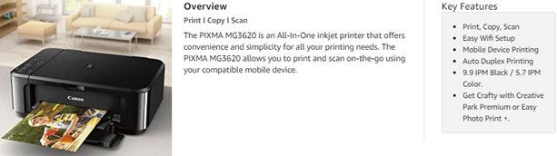 • Mobile device printing: Easily print from your iPhone, iPad, Android or tablet.In The Box : PIXMA MG3620 Wireless Inkjet All-In-One Printer, Manuals and other documents, Setup CD-ROM, FINE Cartridges (Black and Color), Power Cord