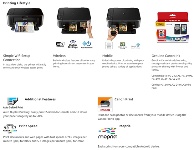 • Powerful printing options: Airprint, Google Cloud Print, NFC, Mopria and Canon Print