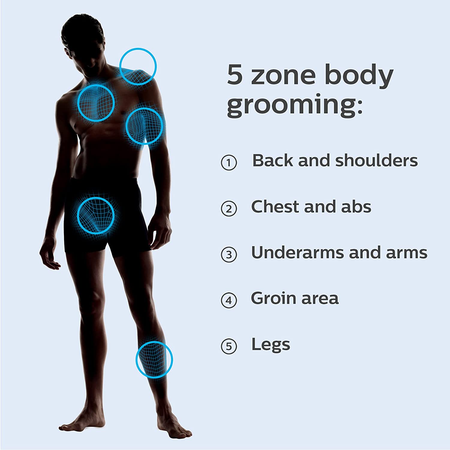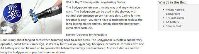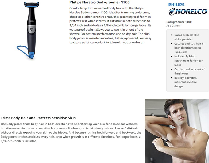 The Philips Norelco body groom 1100 allows you to conveniently and safely trim hair below the neck. The integrated skin protector guards your skin while you trim, while the bi-directional trimmer lets you seamlessly cut hair in both directions. One 3mm comb is included so you can evenly trim longer hairs. The shower cord allows for easy storage. Packaging includes: body groomer, 1 trimming comb, shower cord and aa battery power.