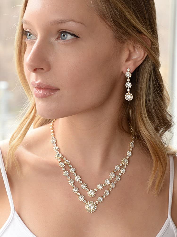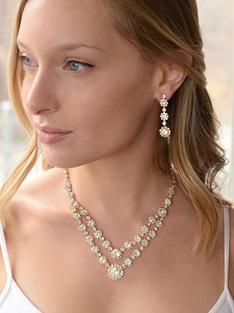Mariell Gold Two-Row Rhinestone Crystal Necklace and Earrings Set - Prom, Brides and Bridesmaids Jewelry