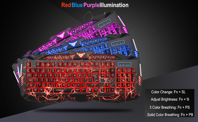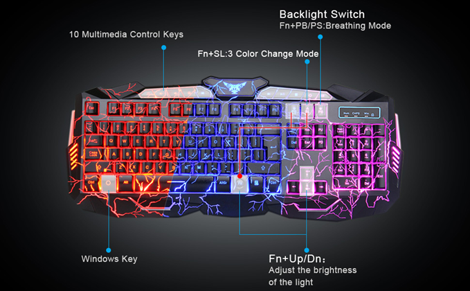 • 【Backlit Mode】 FN+SL: Change 3 backlight color; Fn+PS: 3 color auto-breathing mode; Fn+PB: Solid color auto-breathing mode;Fn+Up: Adjust the brightness plus; Fn+Dn: Adjust the brightness reduction. Crack backlit effect provides a unique visual experience and cool game atmosphere.