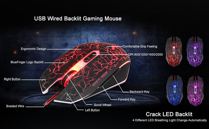 • 【Gaming Mouse】 Ergonomically designed construction,6 Buttons, Made of quality ABS plastic, Comfortable and durable ; 4 Different LED breathing light change automatically; 4 Levels DPI Adjustable: 800/1200/1600/2000; Forward button + DPI button can turn on/off the mouse backlight. Mouse cable length is 67 inches.