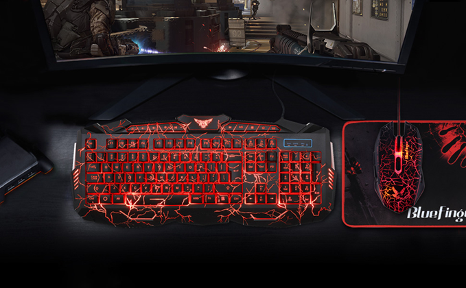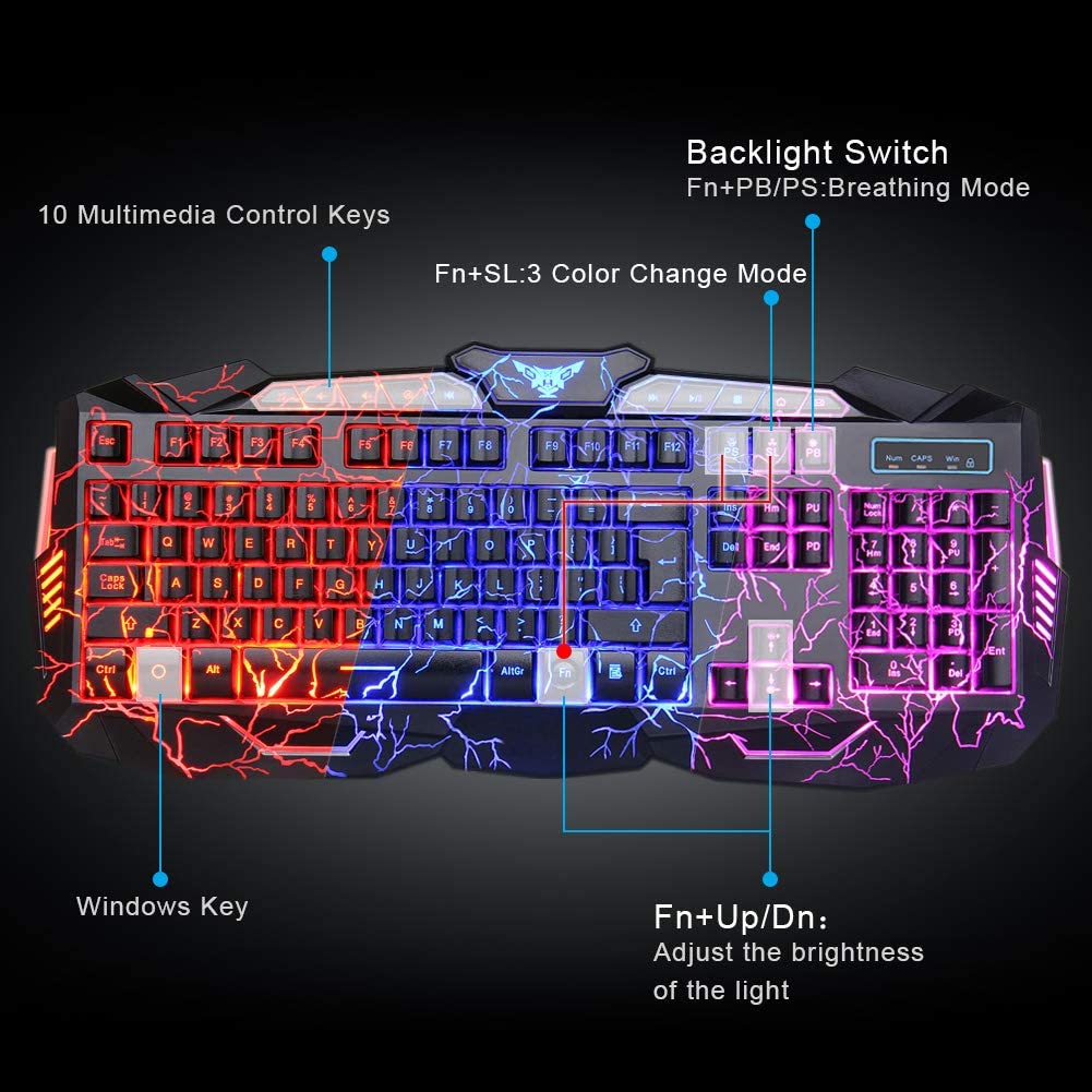 BlueFinger Backlit Gaming Keyboard and Mouse Combo,USB Wired Backlit Keyboard Mouse Game Set,Multimedia Keys,3 Color LED Crack Illumination Keyboard Mouse for Game and Work