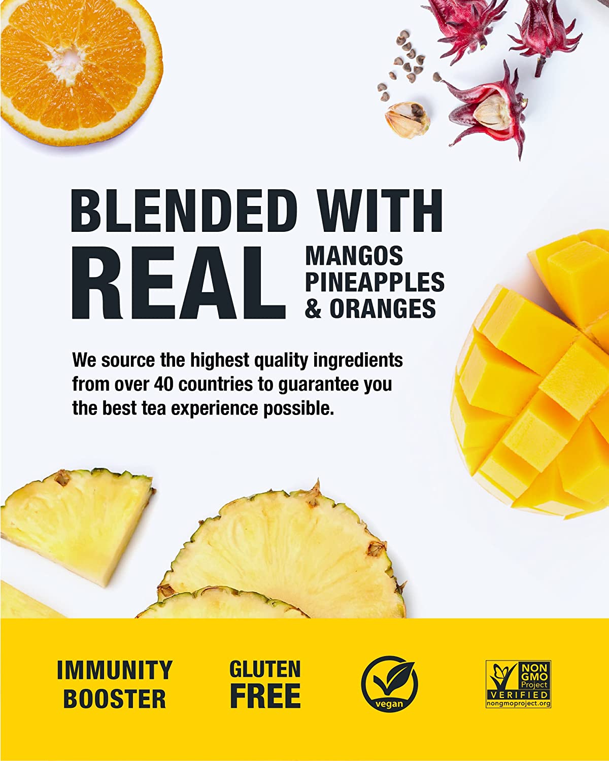• MANGO PINEAPPLE FRUIT TEA has the refreshing, exotic flavor destined to be a fan-favorite; bursting with fruity notes, real pieces of mango, pineapple + oranges; this caffeine-free tea is a healthy alternative to juice the whole family will love