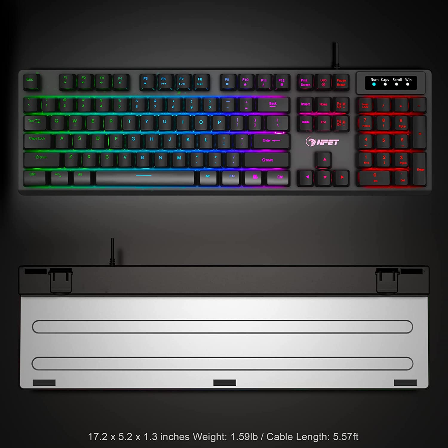 NPET K10 Gaming Keyboard USB Wired Floating Keyboard, Quiet Ergonomic Water-Resistant Mechanical Feeling Keyboard, Ultra-Slim Rainbow LED Backlit Keyboard for Desktop, Computer, PC