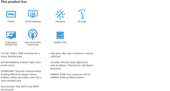 • Earth conscious: The LED backlit LCD monitor is designed to use less power and meets strict energy efficiency guidelines set by the Environmental Protection Agency and U.S. Department of Energy