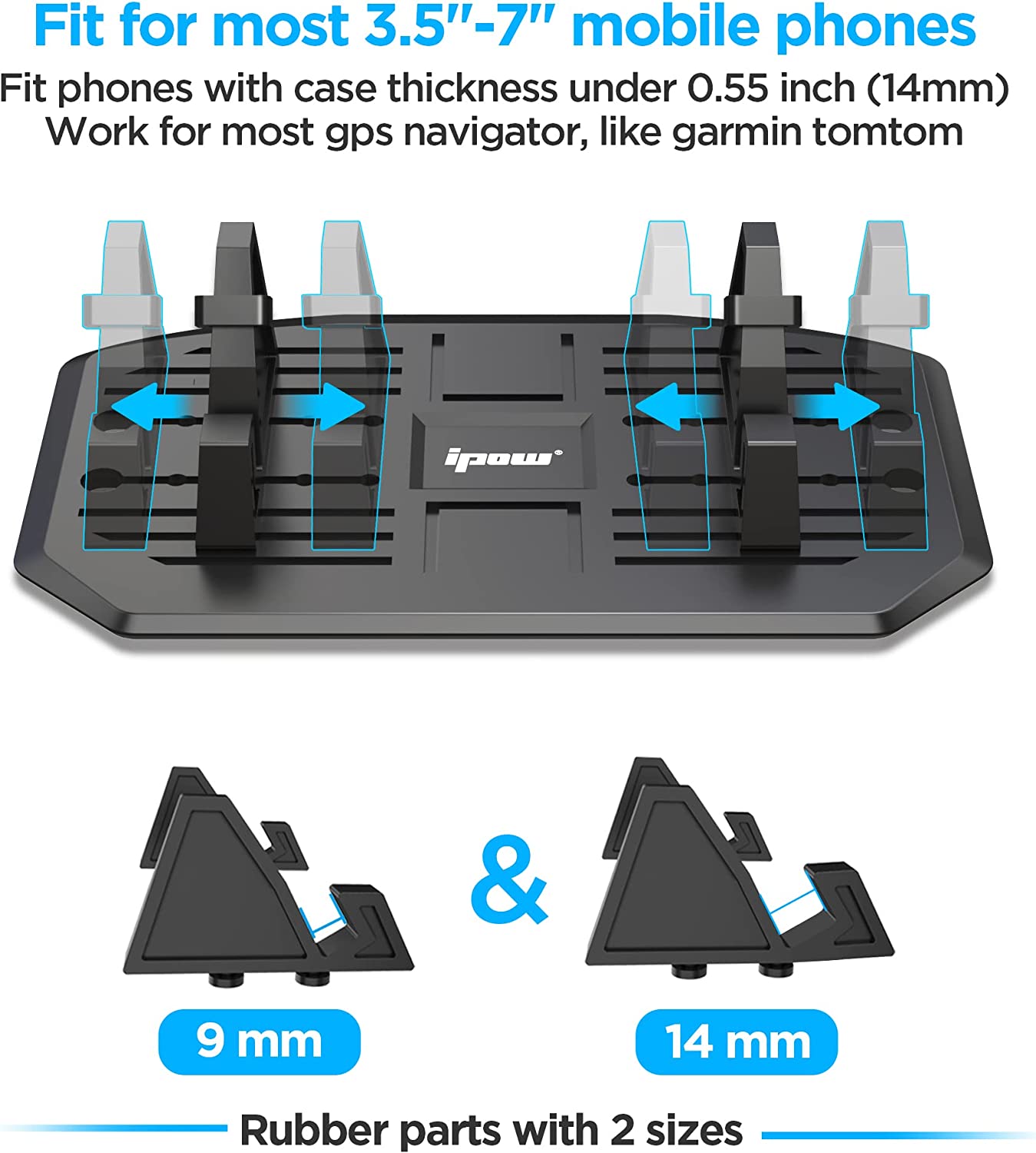 【Holds Different Phones】Two pairs of rubber holders compatible with phones' thickness within 14mm, the slide ways for the rubber "legs" are inserted with sheet metals to offer a strong suppport so your phones stay more snugly.