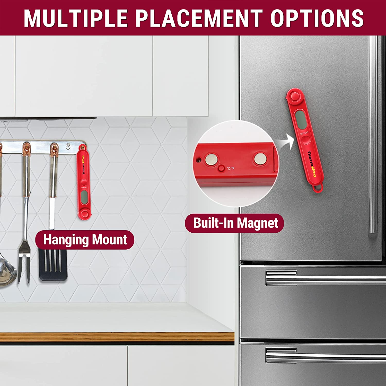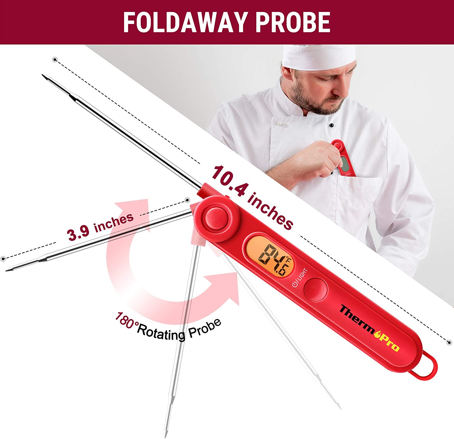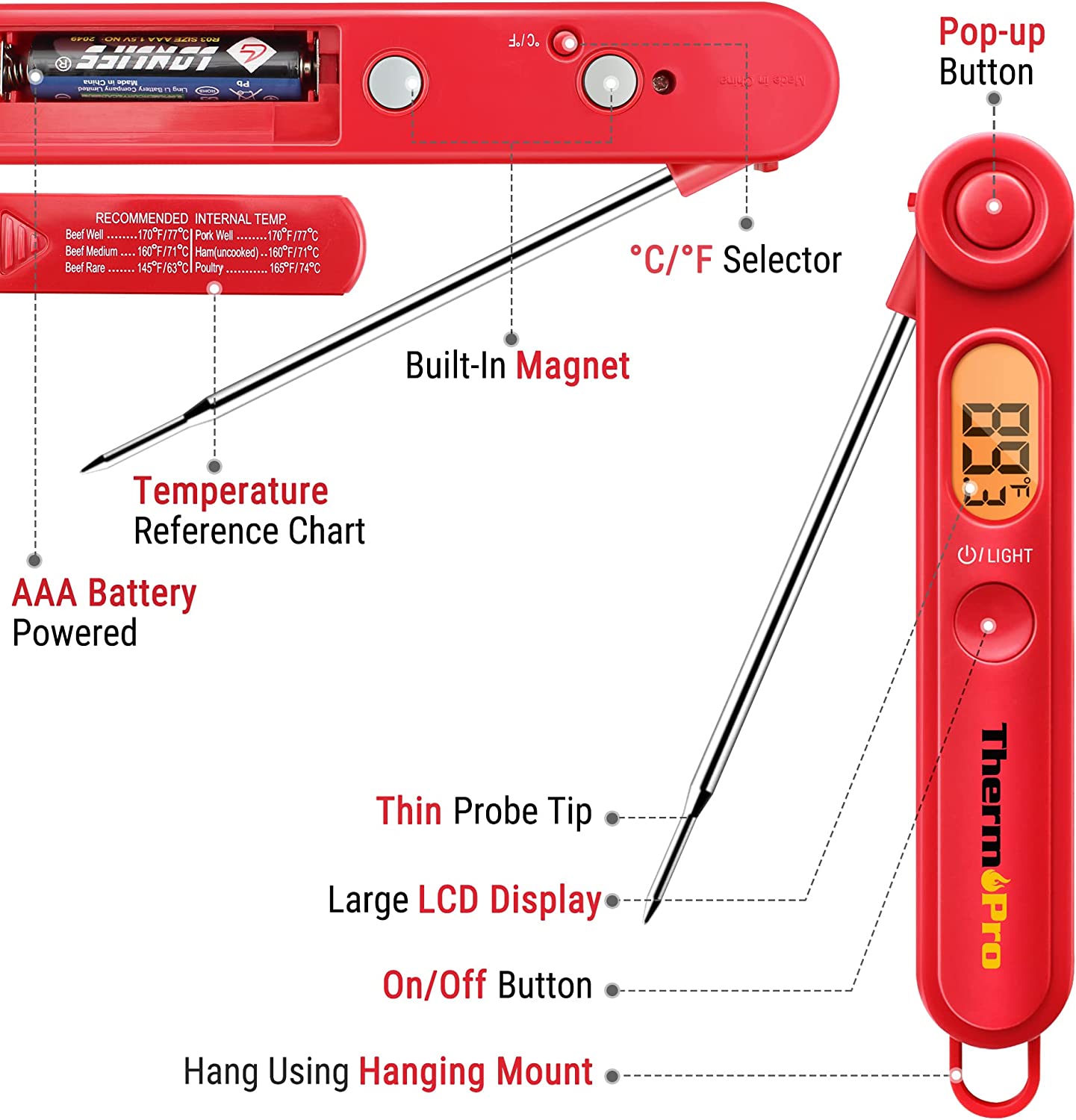 • Easy to use: Kitchen thermometer with foldable probe design folds away easily and locks into base for portability; Magnetic back and hook allows for convenient storage