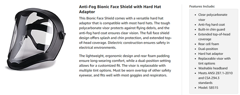 • Must be worn with safety eyewear or goggles; fits comfortably with most goggles and respirators; 100% dielectric (no metal parts); meets ANSI Z87+ and CSA Z94.3 standards