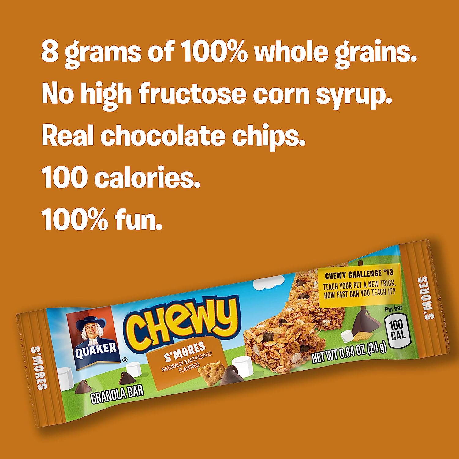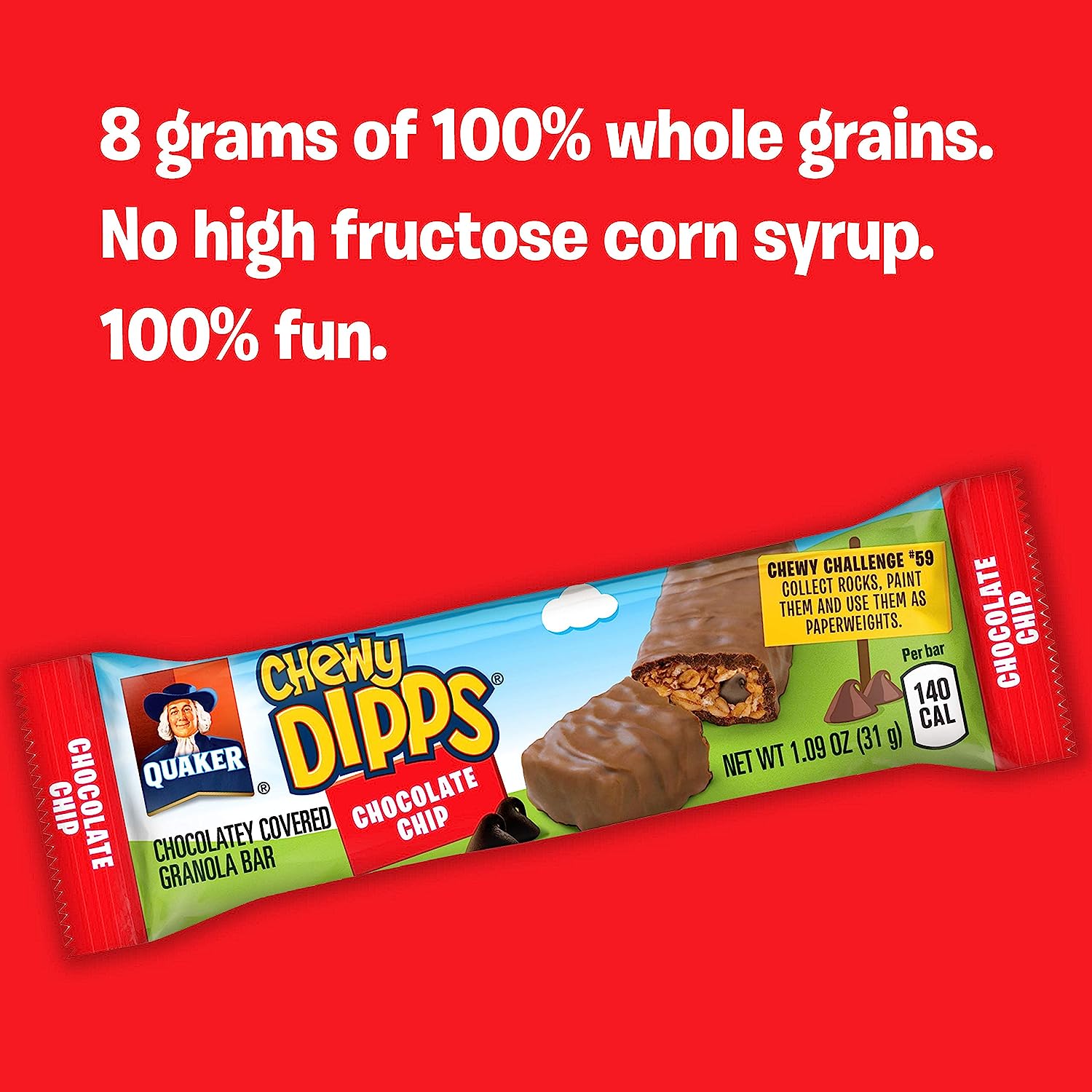 About this item            Includes 58 individually wrapped granola bars you can enjoy at home, at school, or on the go   Features 12 chocolate chip, 12 peanut butter chocolate chip, and 10 s'mores flavor Chewy granola bars, plus 12 chocolate chip and 12 peanut butter flavor Chewy Dipps chocolate covered granola bars  Made with real rich chocolate, indulgent peanut butter-flavored chips, and toasted granola  Packed with 8 grams of 100% whole grains per bar. No high-fructose corn syrup  At only 150 calories or less per bar, Quaker Chewy and Dipps bars are a perfect snack for any occasion