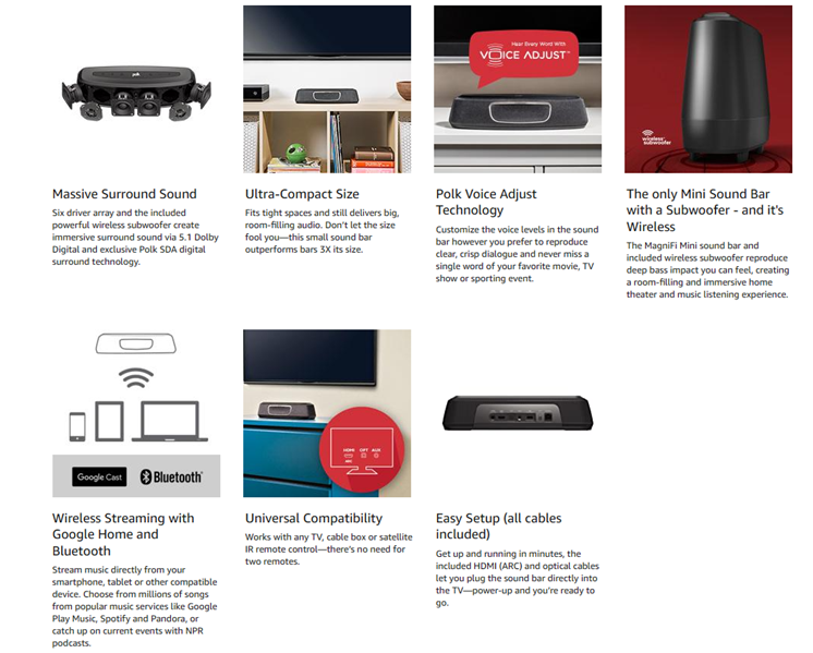 - Polk's exclusive Voice Adjust Technology even lets you INDEPENDENTLY CONTROL VOICE LEVELS maximizing sound clarity and minimizing voice delays and muzzled sounds. Equipped with INDEPENDENT MODES FOR MOVIES, MUSIC, AND SPORTS, it delivers balanced sound clarity so that you hear every word, making your movie, sports and music experience absolutely exquisite
