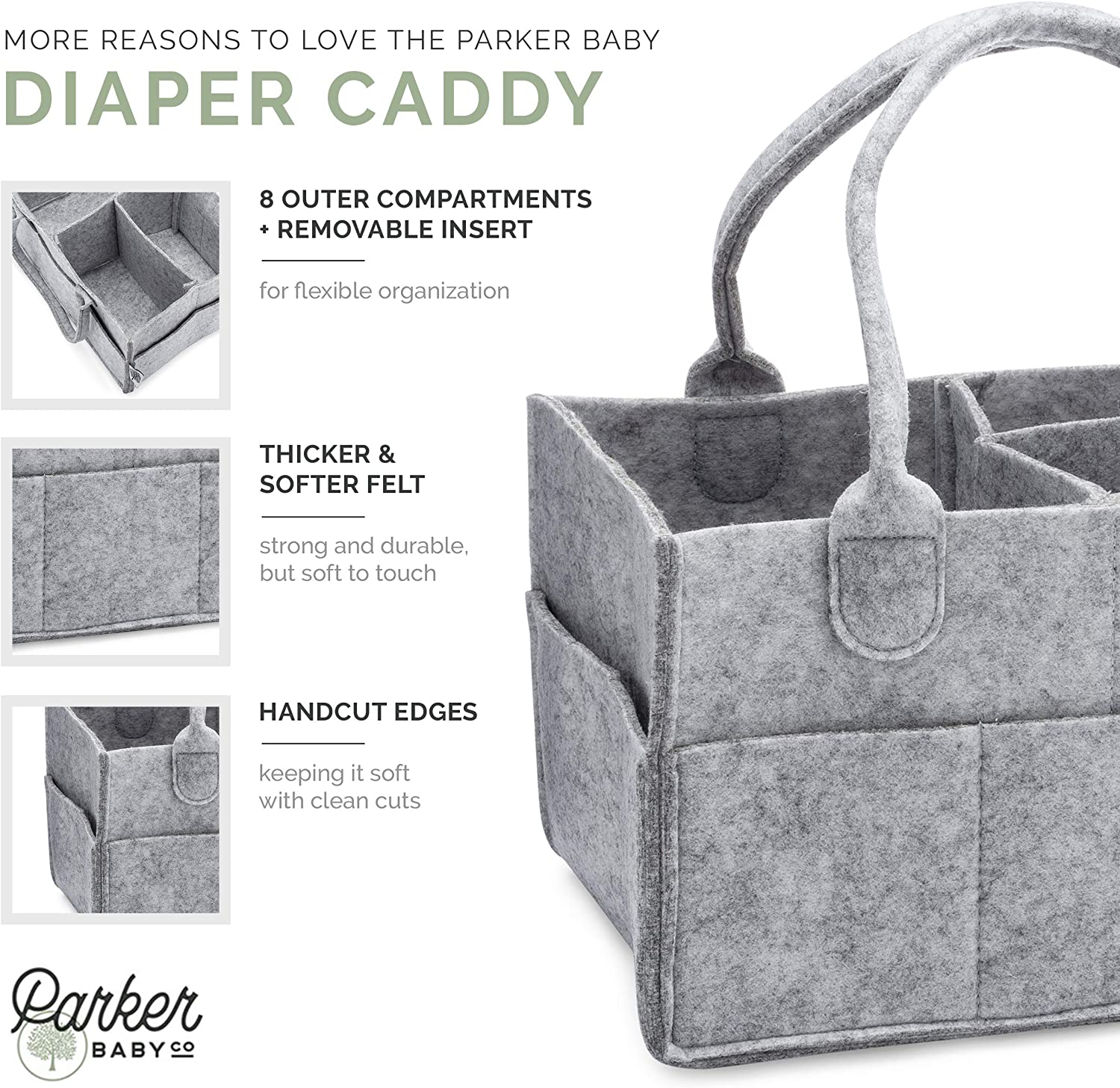 ESSENTIAL STORAGE BASKET FOR NEWBORN PRODUCTS - The Parker Baby Diaper Caddy (patented) is versatile enough for all that baby stuff: baby toys, diapers, baby clothes, baby wipes, bibs, onesies, baby toys, cloth diapers, changing pads, medicine, burp cloths and other baby essentials! Large enough for dozens of diapers and most wipes dispensers.