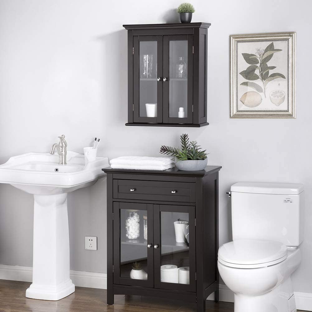 glitzhome Wooden Floor Storage Cabinet with Drawer and Glass Double Doors for Bathroom, Living Room, Bedroom, Kitchen