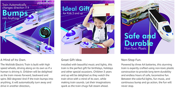 - GREAT GIFT IDEA. With lights, sounds, and bump and go action, the WolVol Electric Train Toy will make a perfect gift for birthdays, holidays and other gift-giving occasions for both boys and girls alike.