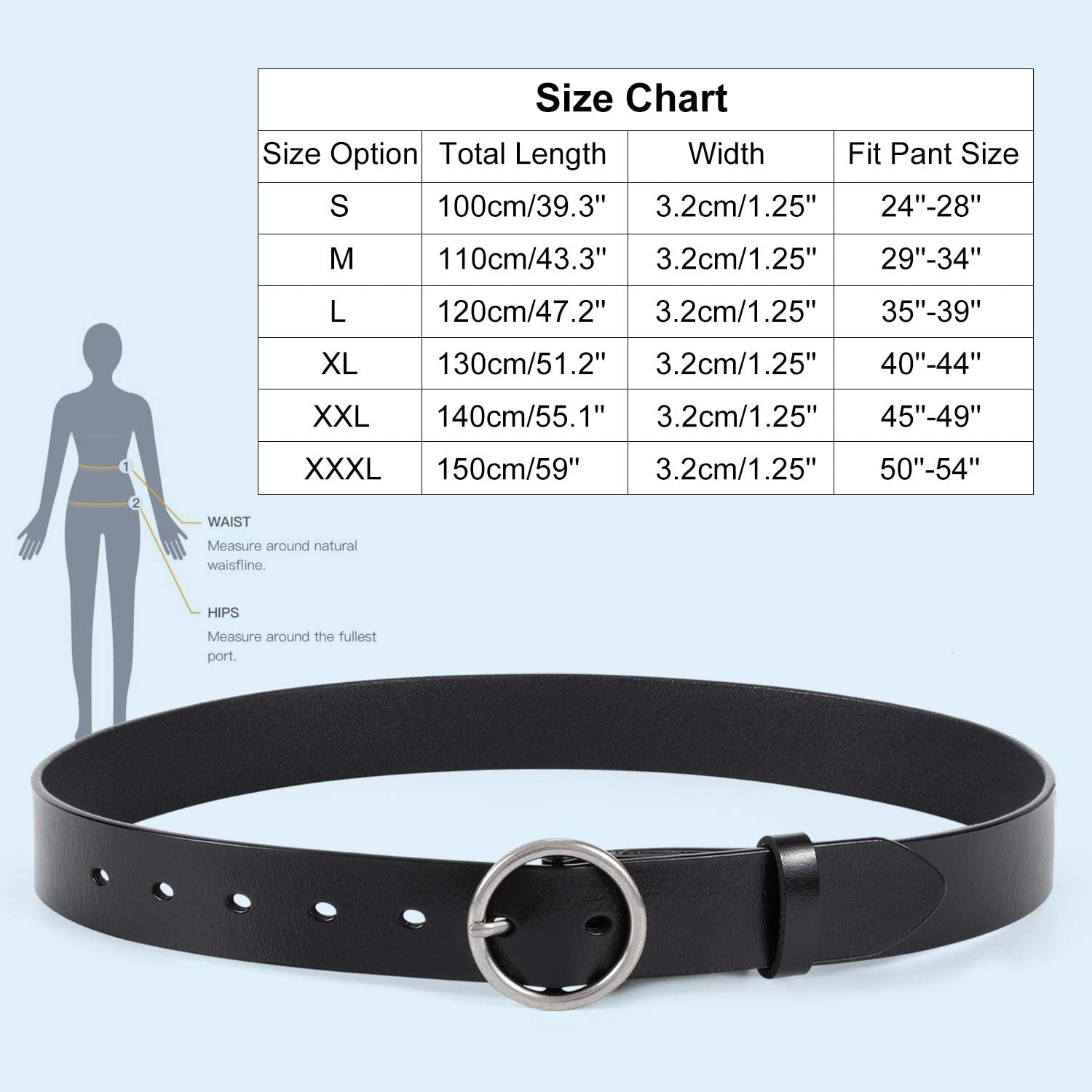 • Suitable Size - From the buckle to the first hole and last hole 28” - 38”, suit for women pant size 28”-45” (US size: 0-16+). To get more accurate size, belts are all tried on by our male/female staffs, you can feel free to buy. Even you are thinner, this belt can be trimmed easily without any damage.