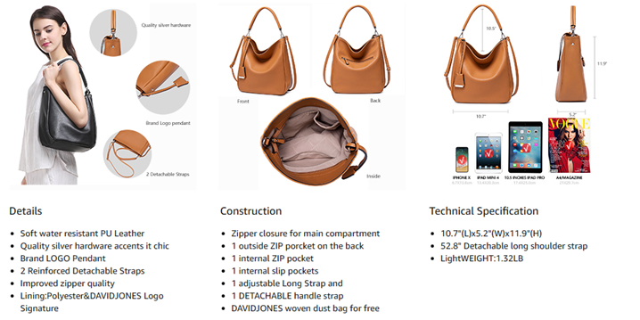 DAVIDJONES:a brand comes from Paris since 1987.Selling Handbags for Women and Girls in More than 100 countries.Great stylish and Convertible Womens Purses.Excellent craftsmanship and refined premium quality leather like PU bags.Decent high end women handbags with affordable price.