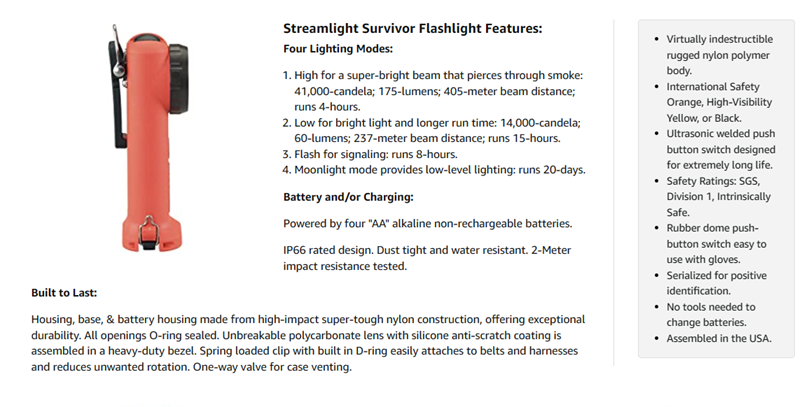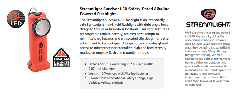 | Included Components | Streamlight Survivor Firefighter Right Angle Light |