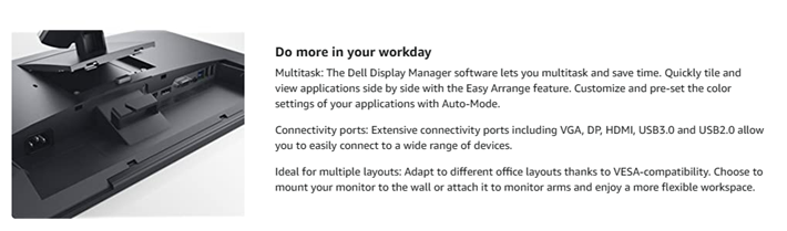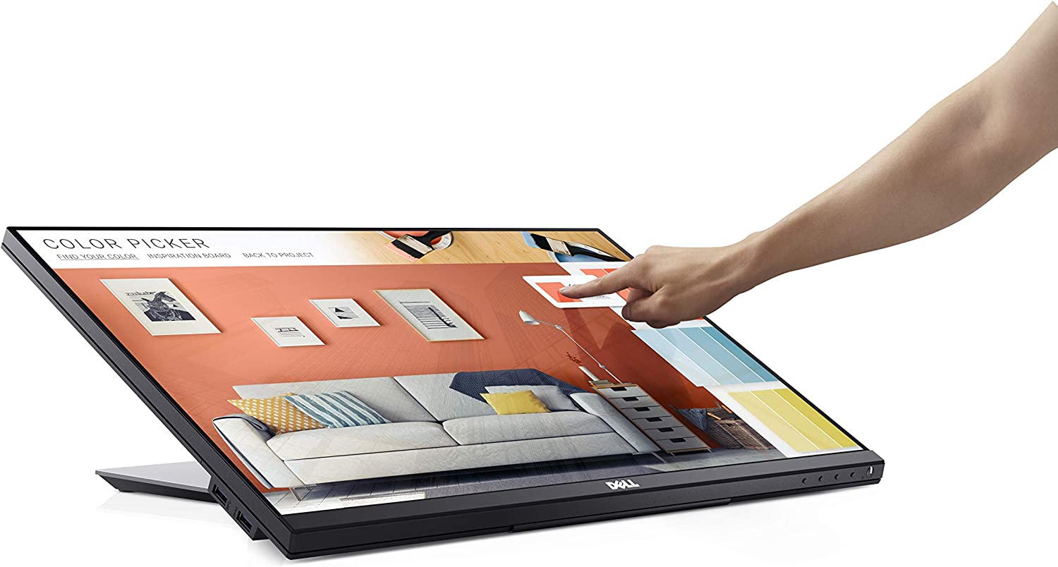 Dell 24 Touch Monitor. Viewable image size (diagonal) 60.47 cm (23.8 inches). Active display area Horizontal - 527.04 mm (20.75 inches), Vertical - 296.46 mm (11.67 inches). Maximum resolution 1920 x 1080 at 60 Hz. Aspect ratio 16:9. Pixel pitch 0.275 mm x 0.275 mm. Brightness (typical) 250 cd/m . Color gamut (typical) 84% (CIE 1976). Color depth 16.7 million colors. Contrast ratio (typical) 1,000:1, Dynamic contrast ratio 8 million:1. Viewing angle (typical) (vertical/horizontal) 178 /178 . Response time (typical) 6 ms gray-to-gray. Panel technology In-plane switching, anti-glare with 3H hardness. Backlight LED. Speaker (optional) Recommended desktop speaker ? Dell 2.0 Speaker System (AE215). Connectors 1 x DisplayPort (ver 1.2)6, 1 x HDMI (ver 1.4), 1 x VGA, 1 x USB 3.0 port upstream, 2 x USB 3.0 ports (side) (including 1 x USB 3.0 BC1.2 charging port), 2 x USB 2.0 ports (bottom), 1 x Analog 2.0 audio line out (3.5 mm jack). Touch features Type: projected capacitive system; Input: bare finger; Points: 10 touch points; Response time: 35 ms; Resolution: 4096 x 4096; Operating systems supported: Windows 10, 8.1, 7. Articulating stand Height adjustable (90 mm), Tilt (-5 to 60 ), Swivel (-30 to 30 ). VESA mounting support (wall mount kit sold separately) 100 mm x 100 mm. Security lock slot (security lock not included); Anti-theft stand lock slot (to panel) AC input voltage/frequency/current 100 to 240 VAC/50 or 60 Hz 3 Hz/1.5 A (typical). Power consumption (typical) 18W. Power consumption (ENERGY STAR) 16W. Power consumption standby/sleep mode <0.3 W